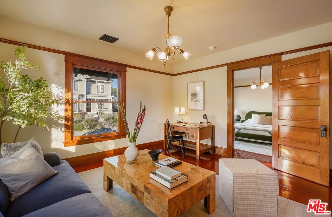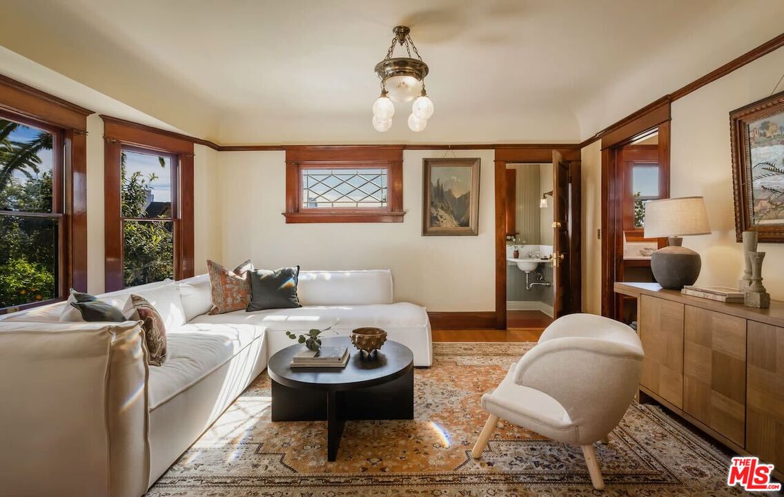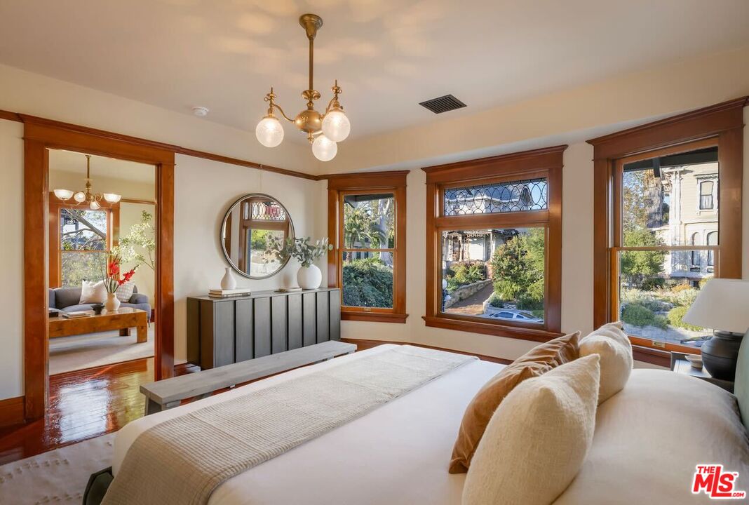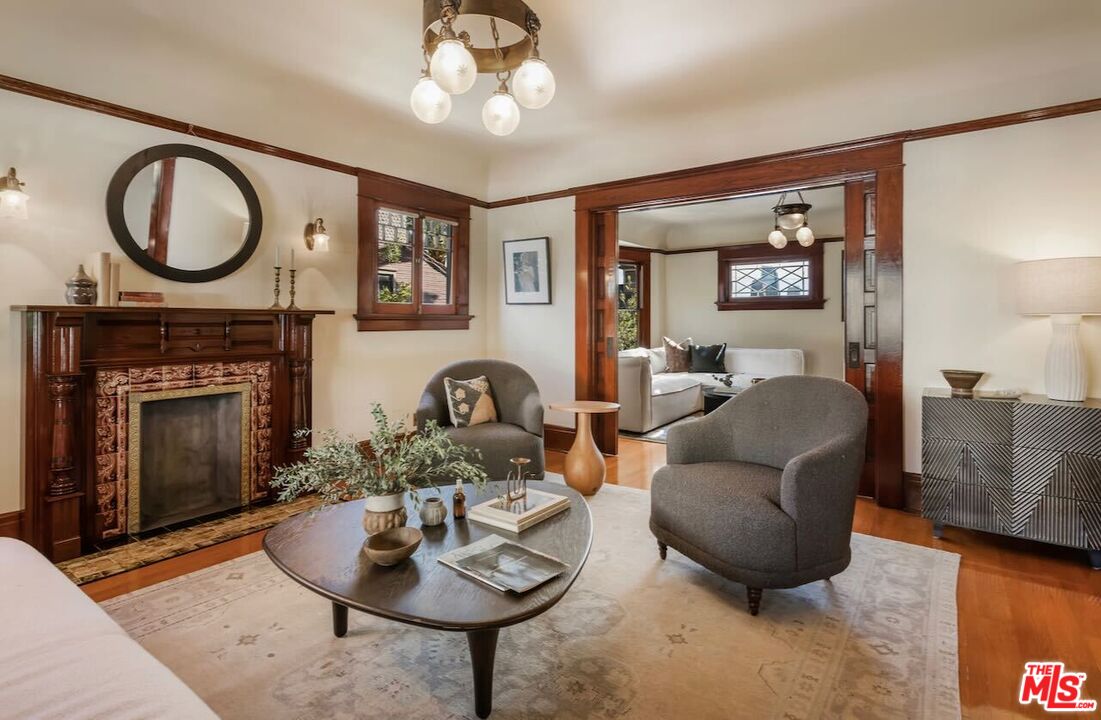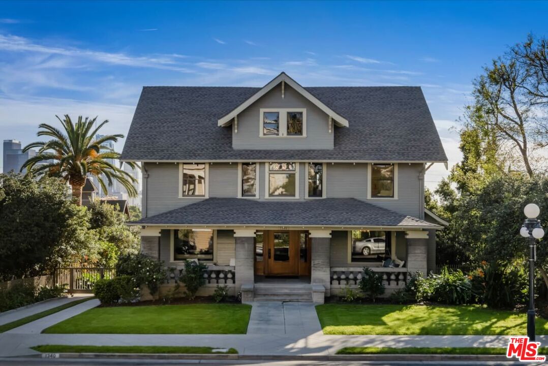 Having just completed a nearly 2-year, $1M+ restoration, The Thomas House is preserved, repaired, refinished, and modernized with all the amenities for today's discerning buyer. Built in 1907 by a wealthy plumber, The Thomas House is one of only two early transitional Craftsman homes on the block. Subdued but stately, with simpler lines, an elegant front porch, and spacious rooms, The Thomas House provides a contrast to its ornate Victorian neighbors. Situated on an oversized lot, this tranquil but solid residence has been meticulously restored, preserving its original ornamental woodwork, pocket doors, tiled decorative fireplaces, hardware, windows, and hardwood floors. All of the bedrooms are on the second floor. The primary suite has an adjoining sitting room, walk-in closet, and en-suite bath with a claw-foot tub and separate shower. System upgrades include a new roof, a zoned HVAC system, modern appliances, and plumbing, electrical, and foundation upgrades. Each sunlit room has captivating views: from the front, the famous Thriller and Charmed Houses, and from the rear, sweeping views of the Downtown skyline. Enjoy the sunset from one of the two back porches or in the large and serene back yard. Let your imagination and creativity soar in the enormous attic and full basement. The property is located in the 1300 Block of Carroll Avenue National Register Historic District in the Angelino Heights HPOZ, which has the highest concentration of Victorian homes in all of Los Angeles. This is your opportunity to become the next steward of one of Los Angeles' cherished historic gems.